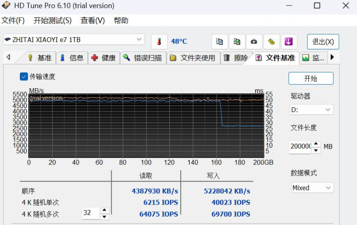 为了提升消费级固态硬盘的性能,SLC缓存成为存储品牌的常用做法,SLC缓存的容量和策略关乎到用户大文件写入体验。在HD Tune Pro中向致态小翼e7 1TB写入200GB数据,通过速度曲线可看出写入速度基本维持在5200MB/s,虽然165GB速度出现回落,但这是SLC缓存策略的体现,SLC缓存并未用尽,日常无论是保存学习资料、视频素材还是游戏基本够用了。