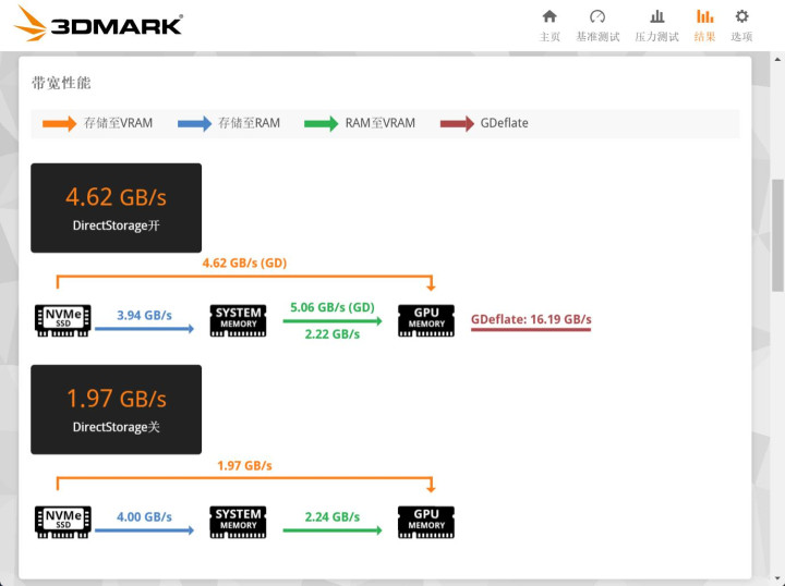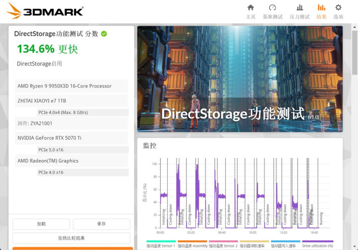 3DMARK DirectStorage功能测试是DirectX12 Ultimate的重要特性,它可以帮助PC更快的加载游戏,充分释放NVMe固态硬盘的潜力。实测致态小翼e7 1TB启用DirectStorage之后,性能提升高达134.6%,进一步提升游戏的加载速度。