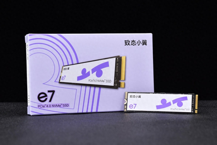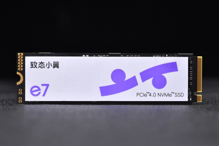 致态小翼e7的正面标签设计非常有特色,整体配色与包装呼应,左侧有黑色的“致态小翼”和紫色的“e7”标识,右侧的图案设计可谓传神,既像是翅膀,传神体现了“翼”字的“羽”字头元素的变形,又像一双眼睛,以新生代“好奇视角”去发现数字世界的精彩纷呈。