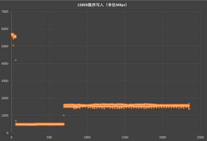 为了进一步探索致态小翼e7 1TB的性能,我们使用专业磁盘测试软件IOmeter在未初始化状态进行32队列深度的128KB顺序写入和4KB随机写入测试。在顺序写入测试中,SLC缓存最高写入速度在5600~5900MBps区间,56秒后SLC缓存用尽进入闪存直写模式,因此SLC缓存容量实际为300GB出头。630秒后完成GC回收速度密集区间提升至1500--1600MB/s区间。
