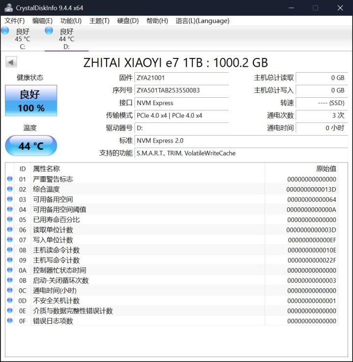 首先用Crystal Disk Info查看下致态小翼e7 1TB的信息,其可用容量为1000.2GB,采用PCIe4.0x4传输模式,支持NVMe2.0标准,在25℃室温下闲时温度稳定为44℃。另外,产品的固件和序列号均为ZY开头,Y即是“翼”的意思。