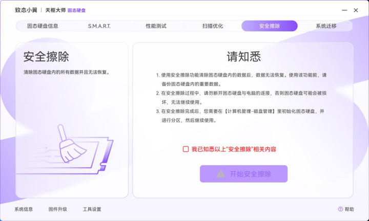 “安全擦除”主要是在固态硬盘的出让、转增或者销毁前,将内部数据彻底抹除销毁且无法被恢复,为用户提供最高级别的数据保护,执行前一定要再三确认里面的数据已经备份或者转移。另一个系统功能“固件升级”在软件下方,当检测到当前固态硬盘的固件版本过旧时,会出现一个小圆点,提醒用户及时升级,确固态硬盘始终处于最佳性能。