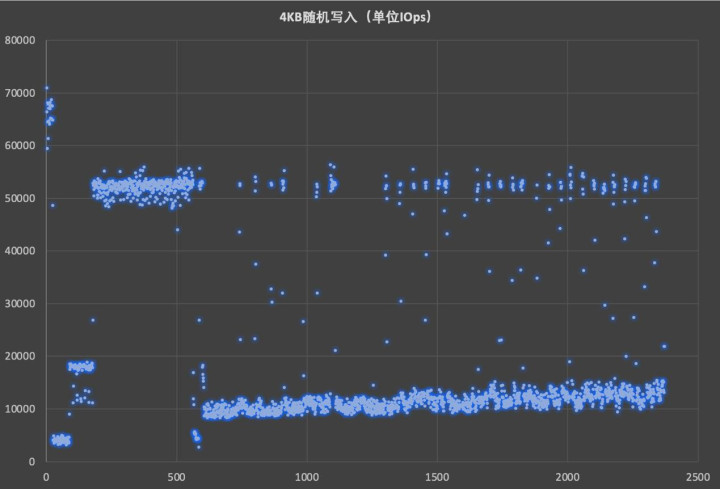 经过50分钟的TRIM后进行4KB随机写入测试。一开始致态小翼e7 1TB最高写入速度密集区间在67000~70000IOps,SLC缓存用尽后进入闪存直写,随后有一段50000--54000IOps的密集区间然后回落至10000IOps,然后小幅爬升至14000IOps左右。