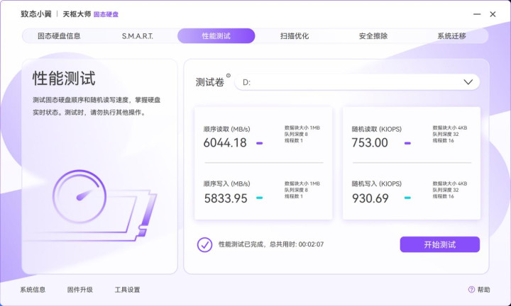 “性能测试”是天枢的大师的新增功能,它可以不用借助第三方的磁盘测试软件,即可对致态品牌的固态硬盘进行测速,非常方便。从测试成绩看致态小翼e7 1TB顺序读写和随机读写性能都达到了标称值。