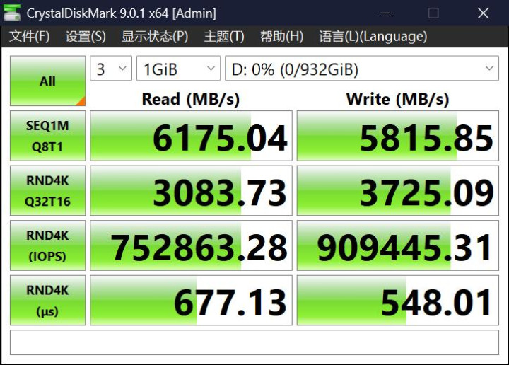 先看Crystal Disk Mark测试成绩,致态小翼e7 1TB最高顺序读写速度达到6175.04MB/s和5815.85MB/s,超出6000MB/s和5500MB/s的标称值;4K随机读写性能达到753K IOPS和909K IOPS,符合750K IOPS和900K IOPS的标称水准,尤其是随机写入性能在DRAMLess产品中可以说是名列前茅。