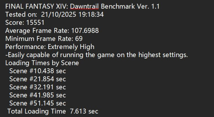 最后是《最终幻想14:曦光旅路》游戏加载模拟测试,这款DEMO能记录所有测试场景的载入时间。我们设置分辨率为3840x2160分辨率和最高画质,致态小翼e7 1TB加载所有场景时间仅为7.61秒,可大幅缩短游戏的加载时间,降低玩家跑图时模型、贴图等素材实时加载的延迟。
