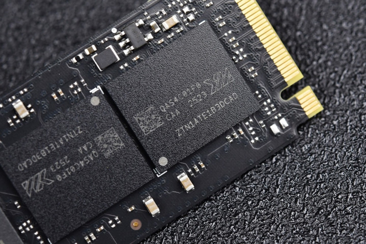 致态小翼e7采用标准的M.2 2280规格和单面PCB设计,广泛兼容各类台式机主板和笔记本电脑,而且发热量也更低。揭开去正面标签可知采用DRAMLess方案,黑色PCB采用一颗主控芯片+四颗NAND FLASH芯片的布局,显得非常饱满。