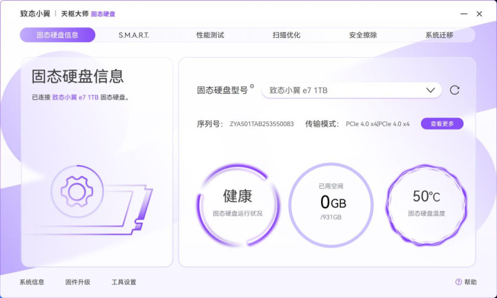 相信各位致友对于致态自己的专属管理软件——天枢大师一定不陌生,它能让用户随时了解固态硬盘的健康状态、进行原厂级的维护。全新版本除了原有的SMART健康信息和安全擦除等功能,还增加了多个实用功能和清新配色的致态小翼皮肤。“固态硬盘信息”可以看到致态小翼e7 1TB的序列号、传输模式,以及运行时的健康状态、已用空间和当前温度等内容。