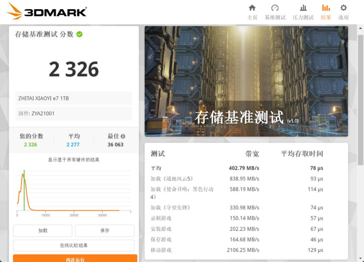 3DMARK存储基准测试通过多款知名游戏的加载、保存、移动等操作,来评估固态硬盘的游戏性能,对于玩家来说有较高的参考价值。结果显示,致态小翼e7 1TB成绩为2326分,平均带宽402.79MB/s,平均存取时间78μs。